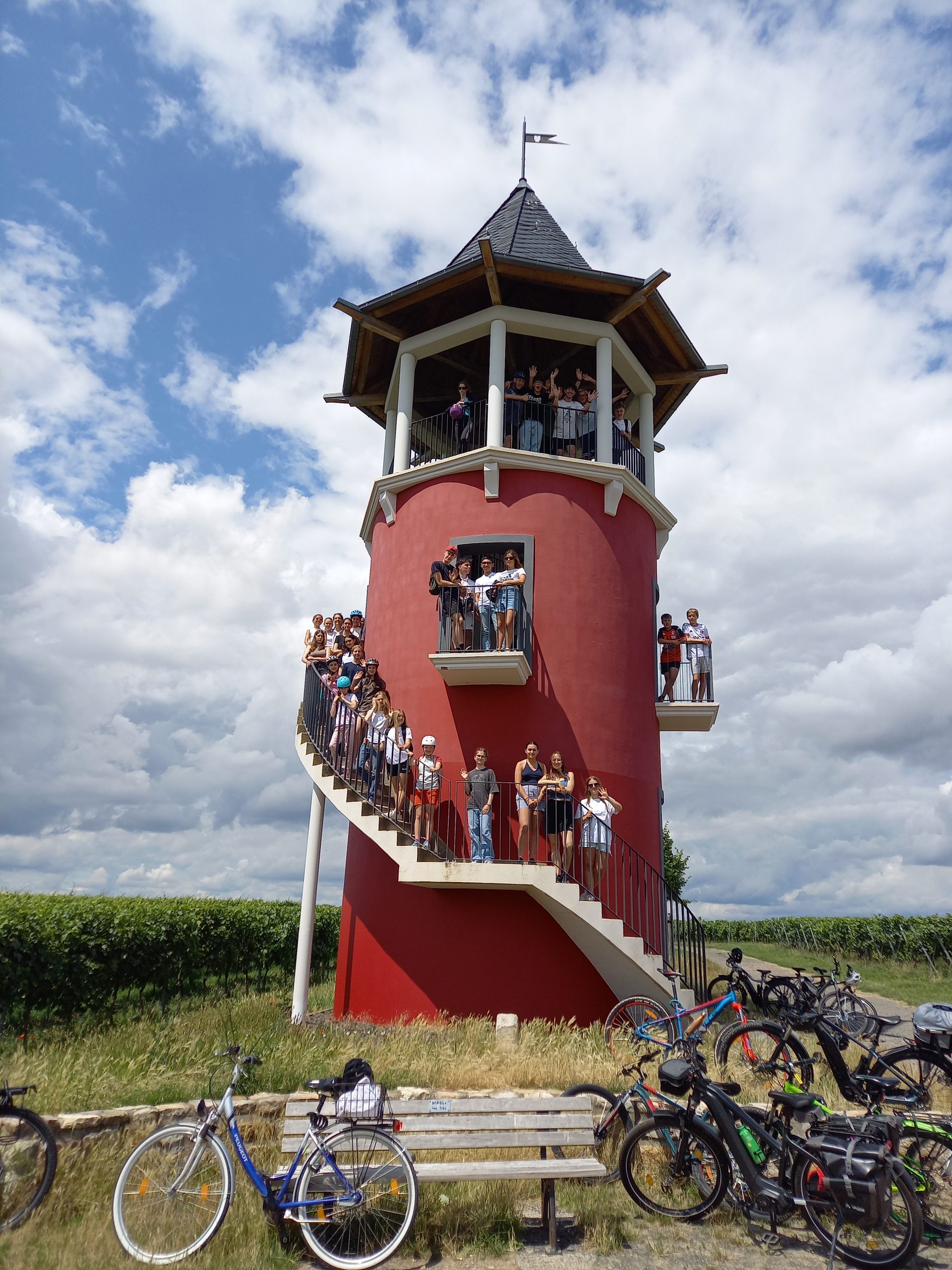 Heute machten wir mit unseren Fahrrädern eine kleine „Tour de Rheinhessen“. Mit fast 60 Radfahrern war das eine große organisatorische Herausforderung, die wir alle sehr gut gemeistert haben. Unser erster Halt war die Firma Juwi. Dort durften wir viel über das Unternehmen selbst sowie deren Betätigungsfelder im Bereich Wind- und Solarenergie erfahren. Im Wind- und Solarpark Wörrstadt wurden uns die Dimensionen unter so einem Windrad dann auch besonders bildlich. Weiter ging es zum Picknick in den Neuborn. Frisch gestärkt drehten wir noch eine größere Schleife am Burgunderturm vorbei und besuchten das Wörrstadter Schwimmbad. Nach dieser Erfrischung führte uns der Weg zurück nach Sulzheim und wir freuten uns, dass wir ohne größere Pannen und Stürze die sonnige Radtour geschafft hatten.