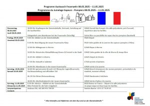 Gleich nach den Kerbetagen erwarten wir den Besuch aus unseren französischen Partnergemeinden der Communauté de Communes d’Erve et Charnie. Von Donnerstag, den 08.05. bis Sonntag, den 11.05. begrüßen wir eine rund 45-köpfige Reisegruppe. Nachdem im vergangenen Jahr Mitglieder der Sulzheimer Feuerwehr zu Gast in Frankreich waren, sind nun aktive Feuerwehrleute aus Sainte-Suzanne unter den Teilnehmern für den Gegenbesuch. Das Programm wird daher teilweise feuerwehr-spezifisch gestaltet und auch die Abendveranstaltungen sind im neuen Gerätehaus der Feuerwehr geplant.