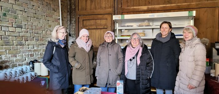 In der weihnachtlich geschmückten Scheune am Kirchplatz  konnte man selbst gemachte Kuchen und Torten und köstlich duftenden Kaffee genießen. Am Stand mit den hausgemachten Marmeladen, dem Eierlikör, Weihnachtsgebäck und den Weihnachtskränzen und  Gestecken war reger Betrieb und auch ein Zelt mit Weihnachtsdekoration zog die Besucher an.